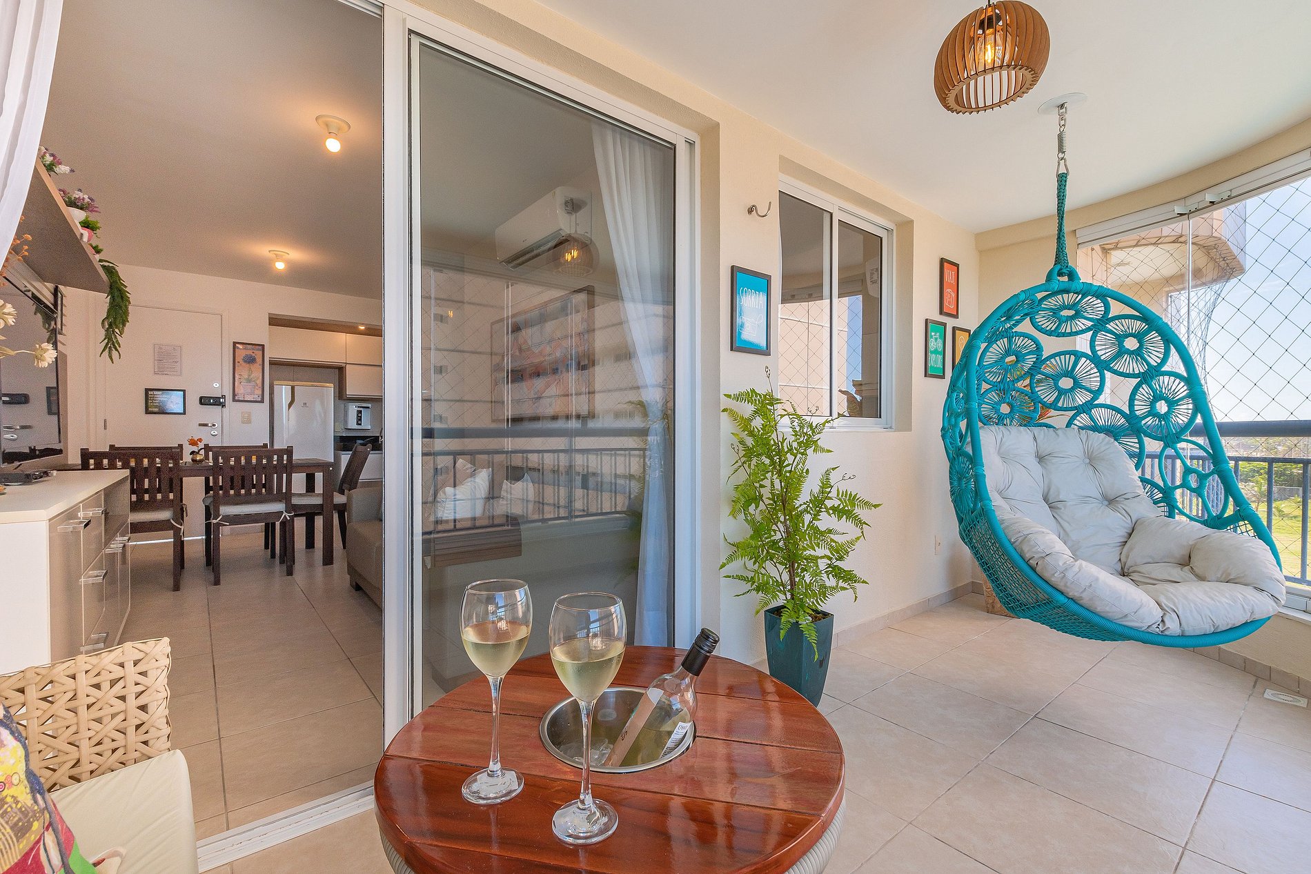- Dê um look no aconchegante varandão: Relaxe… saboreando um vinho gelado na champanheira ou desfrutando da linda vista no confortável balanço.