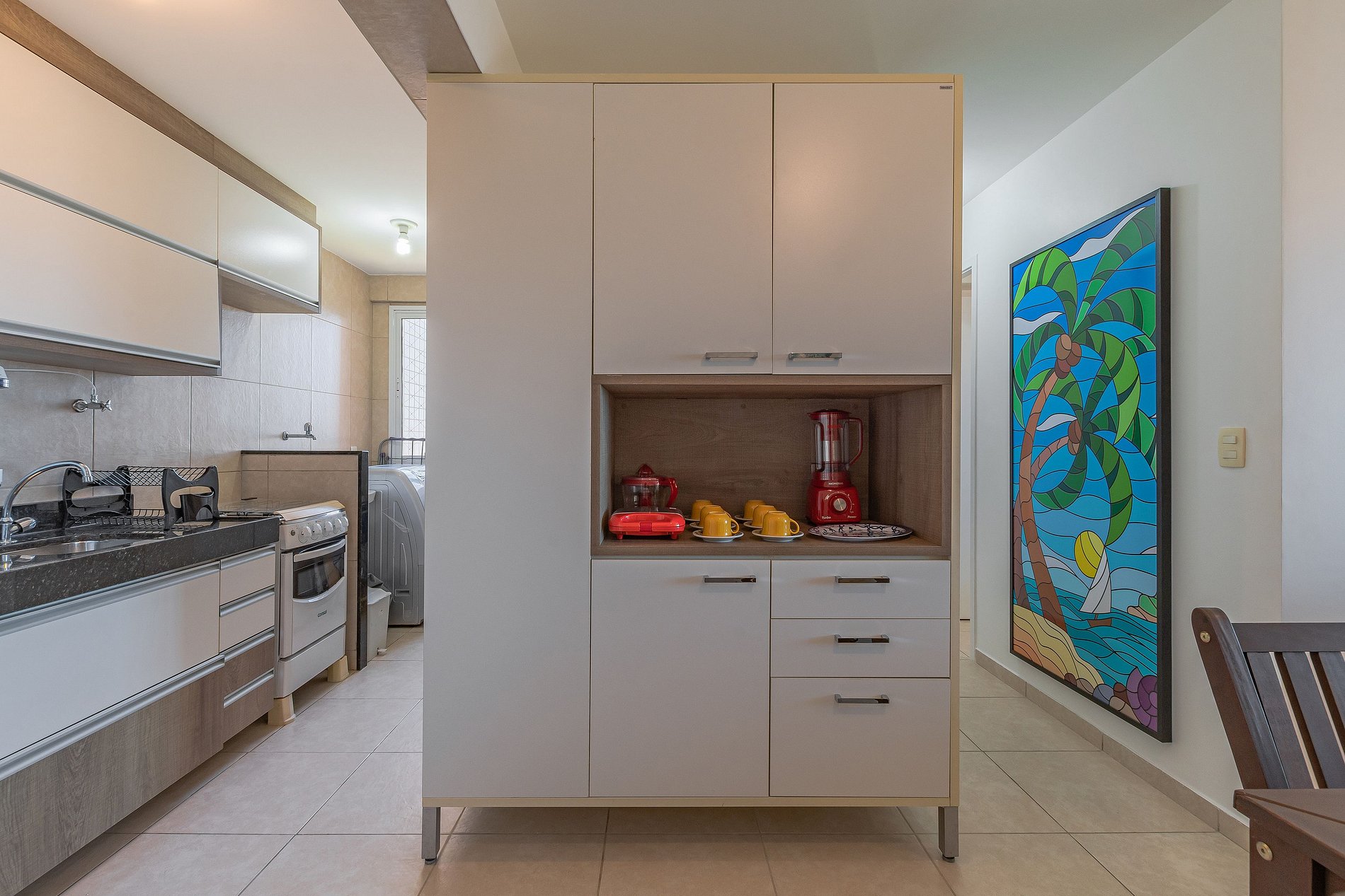 - Cozinha completa com geladeira, fogão, forno, sanduicheira, liquidificador, espremedor, cafeteira e todos os utensílios e aparelhos de qualidade.
