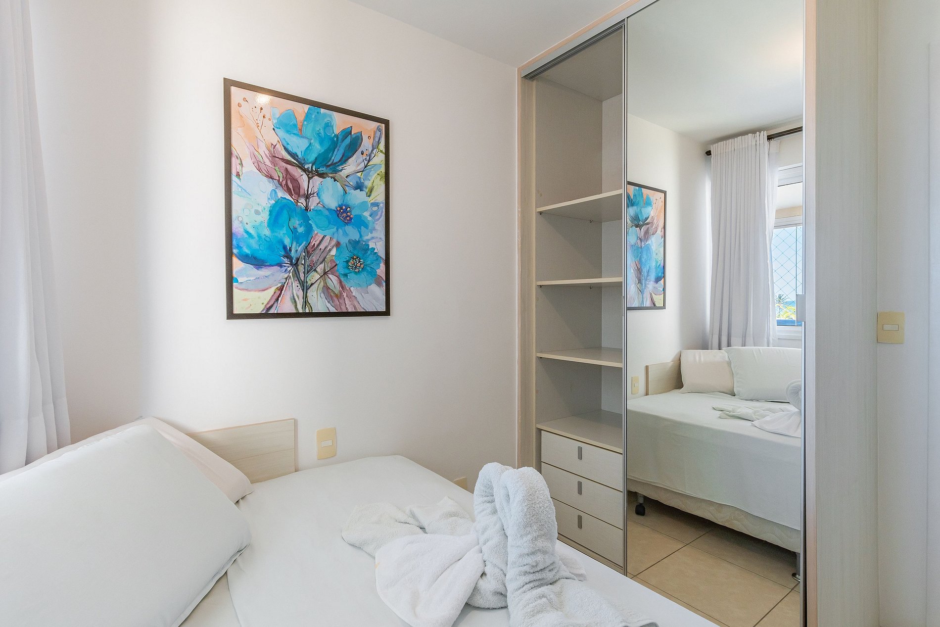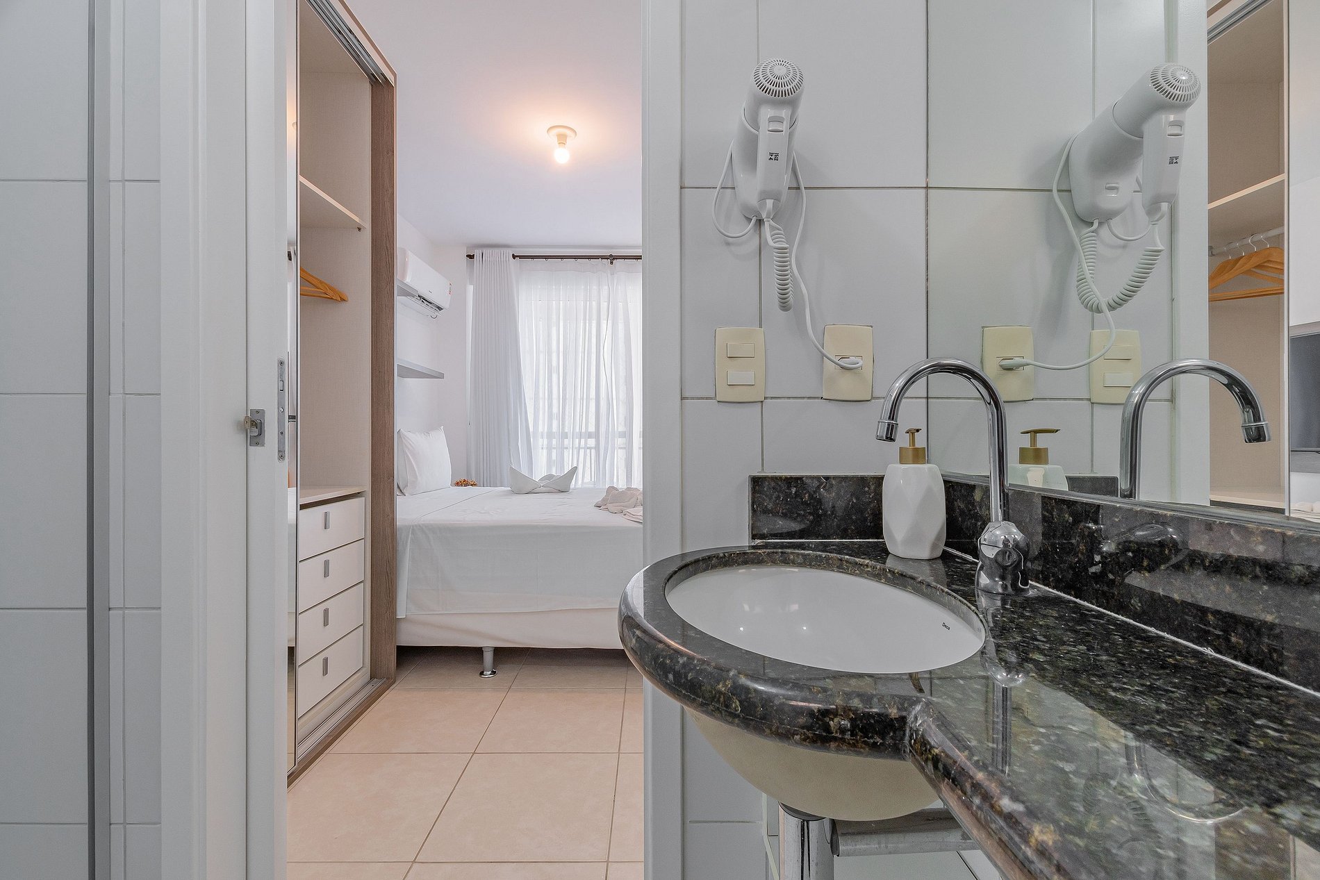 - 2 quartos com suíte e armários espaçosos, equipados com TV, ar-condicionado e secador de cabelos na suite.